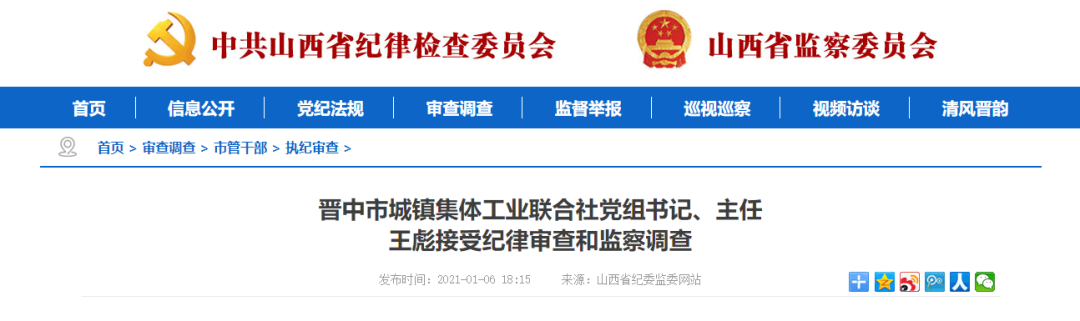 晋中市城镇集体工业联合社党组书记、主任王彪涉嫌严重违纪违法,目前正接受晋中市纪委监委纪律审查和监察调查。