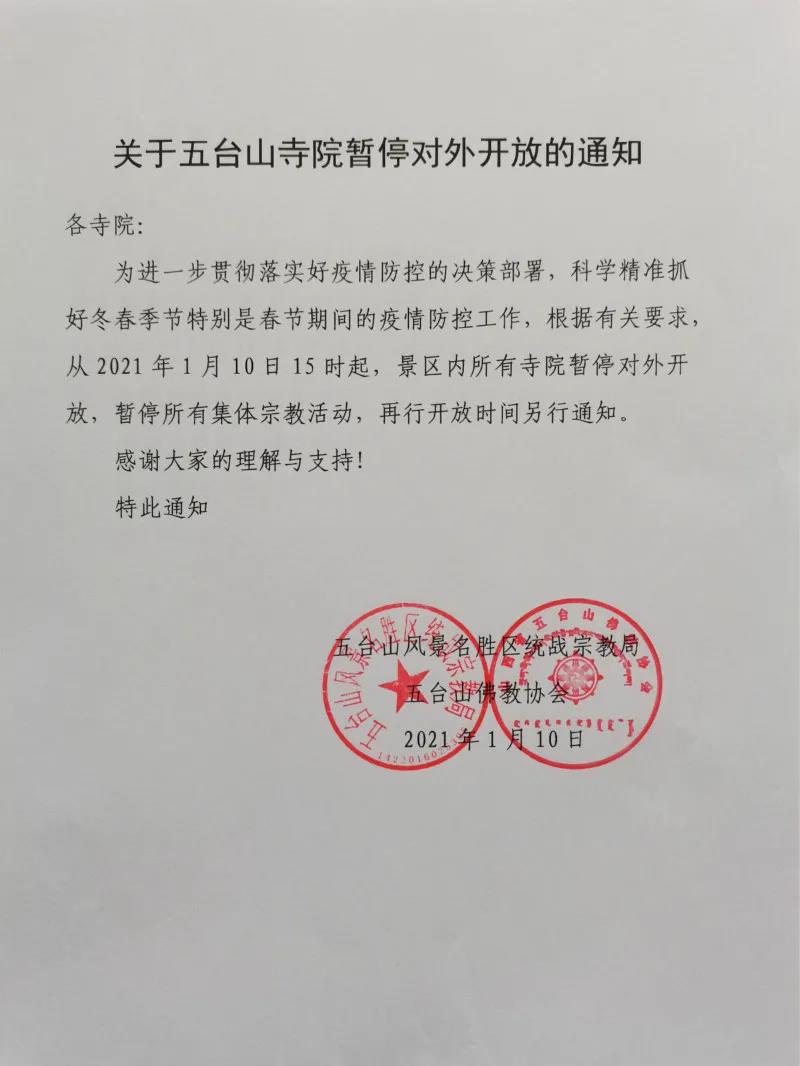 为进一步贯彻落实好疫情防控的决策部署,科学精准抓好冬春季节特别是春节期间的疫情防控工作,根据有关要求,从2021年1月10日15时起,景区内所有寺院暂停对外开放,暂停所有集体宗教活动,再行开放时间另行通知。