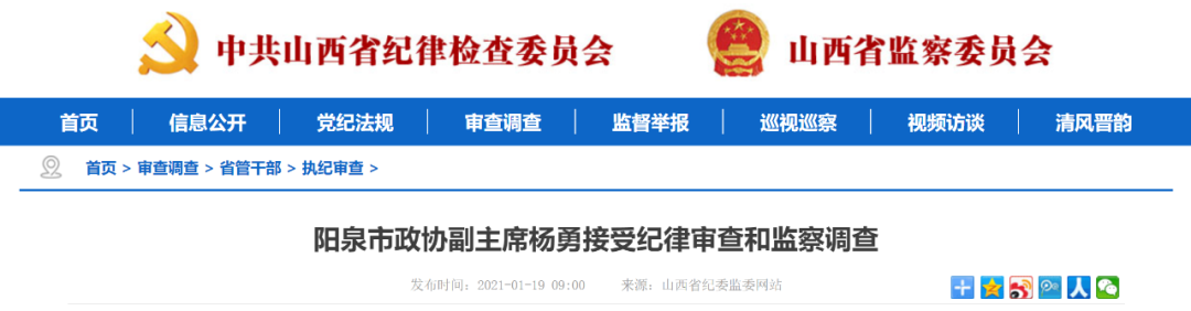 阳泉市政协副主席杨勇涉嫌严重违纪违法,目前正接受省纪委监委纪律审查和监察调查。