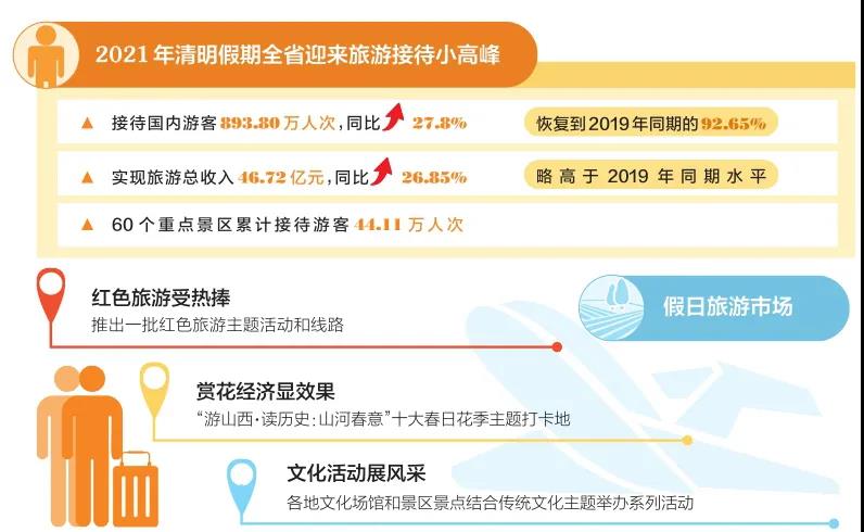 山西省疫情防控措施严密有力,文化旅游市场高速复苏,全省迎来旅游接待小高峰。综合通讯运营商和旅游大数据联合实验室专项调研数据,假日期间全省共接待国内游客893.80万人次,同比增长27.8%,恢复到2019年同期的92.65%。实现旅游总收入46.72亿元,同比增长26.85%,略高于2019年同期水平。全省60个重点景区累计接待游客44.11万人次。