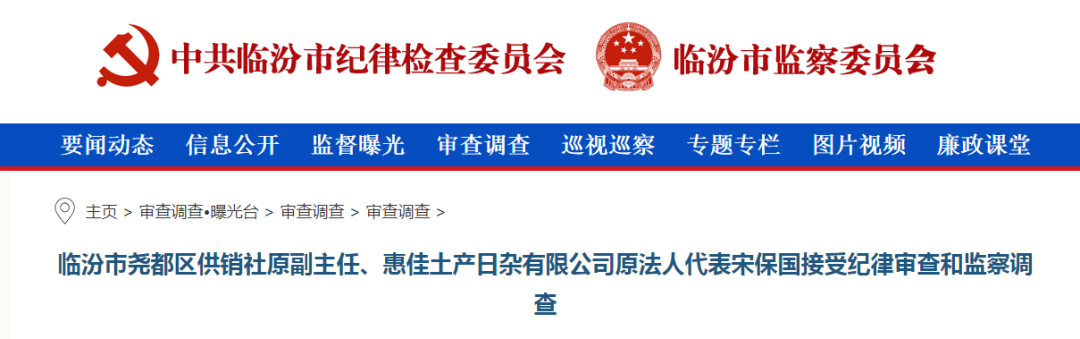 临汾市尧都区供销社原副主任、惠佳土产日杂有限公司原法人代表宋保国涉嫌严重违纪违法,目前正接受尧都区纪委监委纪律审查和监察调查。