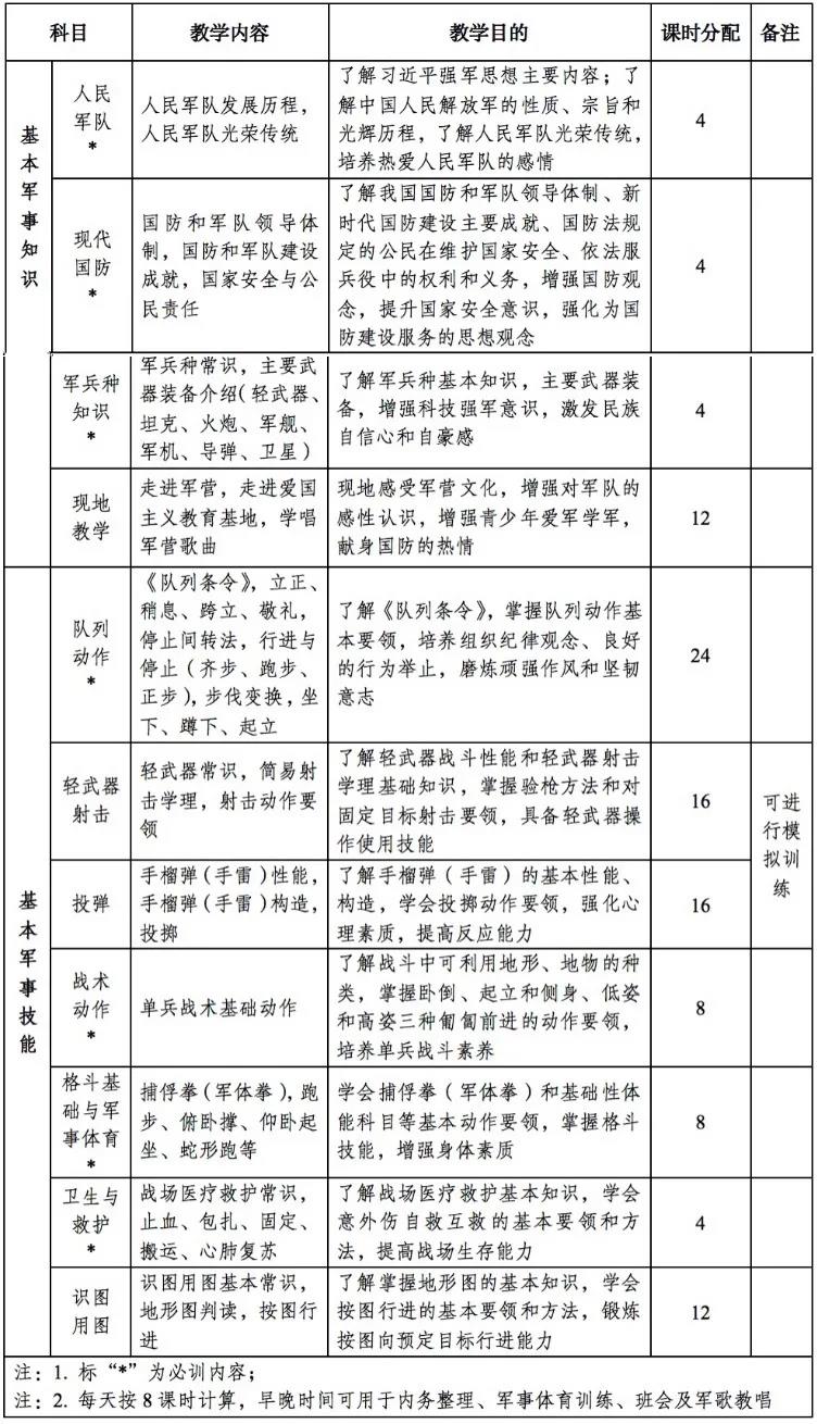 《大纲》明确,高中生军训总计不得少于7天56课时。教学包括基本军事知识和基本军事技能,其中,心肺复苏被列入卫生与救护科目教学内容。