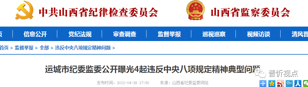 近日,运城市纪委监委公开曝光4起违反中央八项规定精神典型案例。具体如下。