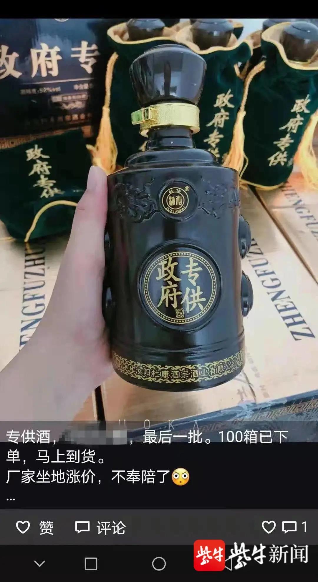 近日,江苏张家港市市场监督管理局接到热心市民举报称有人通过微信朋友圈售卖政府专供酒,图片中的白酒既无产品标签,也没有任何包装,瓶身只见大大的“政府专供”字样,其怀疑该酒的来源、质量都可能有问题。