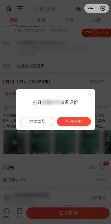 用户浏览商品评价过程中,中途被引导打开 app,影响继续浏览商品页面。