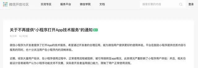 微信称,微信小程序为开发者提供了打开 App 的技术服务,希望通过开发者的合理应用,能为微信用户提供更好的使用体验。平台在鼓励小程序提供优质内容与服务的同时,也十分关注用户在小程序内的流畅体验。