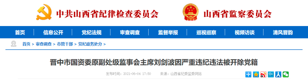 日前,晋中市纪委监委对晋中市国资委原副处级监事会主席刘剑波严重违纪违法问题进行了立案审查调查。