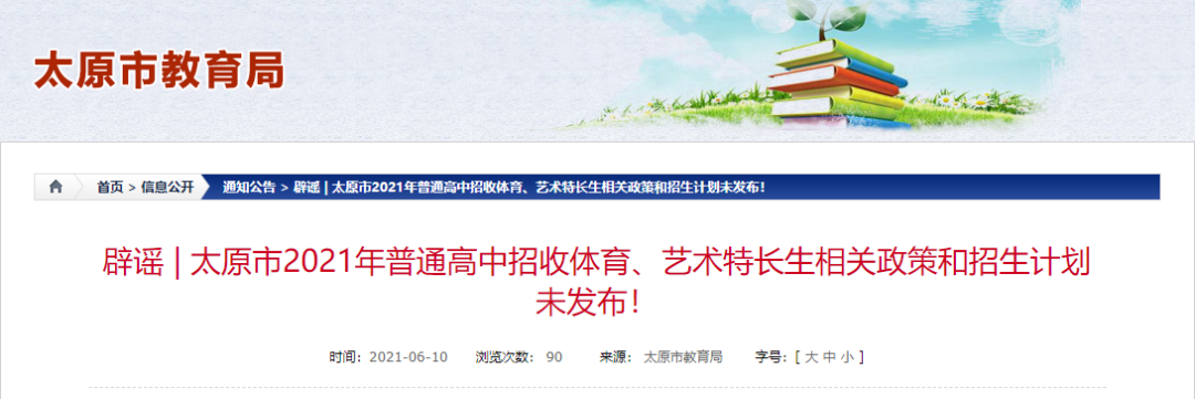 伴随着中考日期的临近,许多考生和家长都十分关注今年太原市普通高中招收体育、艺术特长生的相关政策和招生计划。目前,太原市教育局正在按照省教育厅普通高中招生计划及特长生招生要求,加紧出台太原市2021年普通高中招收体育、艺术特长生的相关政策和招生计划,未通过任何媒体发布相关消息。请大家不要信谣传谣。