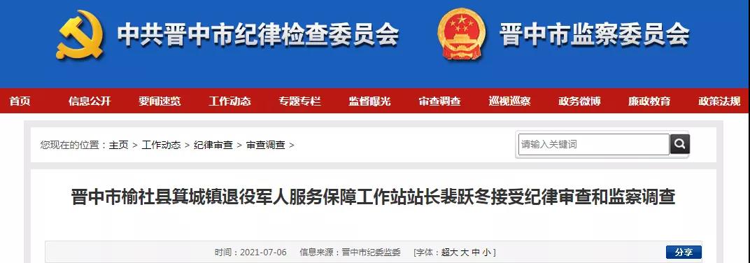 晋中市榆社县箕城镇退役军人服务保障工作站站长裴跃冬涉嫌严重违纪违法,目前正接受榆社县纪委监委纪律审查和监察调查。