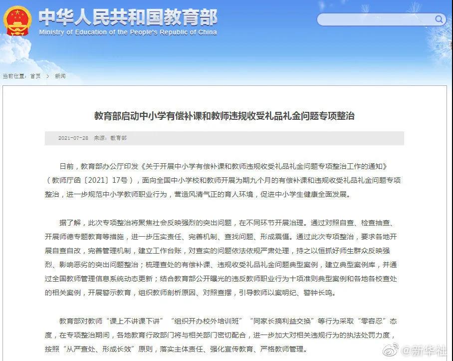 记者28日从教育部网站获悉,教育部办公厅日前印发《关于开展中小学有偿补课和教师违规收受礼品礼金问题专项整治工作的通知》,面向全国中小学校和教师开展为期九个月的有偿补课和违规收受礼品礼金问题专项整治。通过此次专项整治,要求各地开展自查自改,完善管理机制,建立工作台账,对查实的问题依法依规严肃处理,持之以恒抓好师生群众反映强烈、影响恶劣的突出问题整治。教育部对教师“课上不讲课下讲”“组织开办校外培训班”“同家长搞利益交换”等行为采取“零容忍”态度。