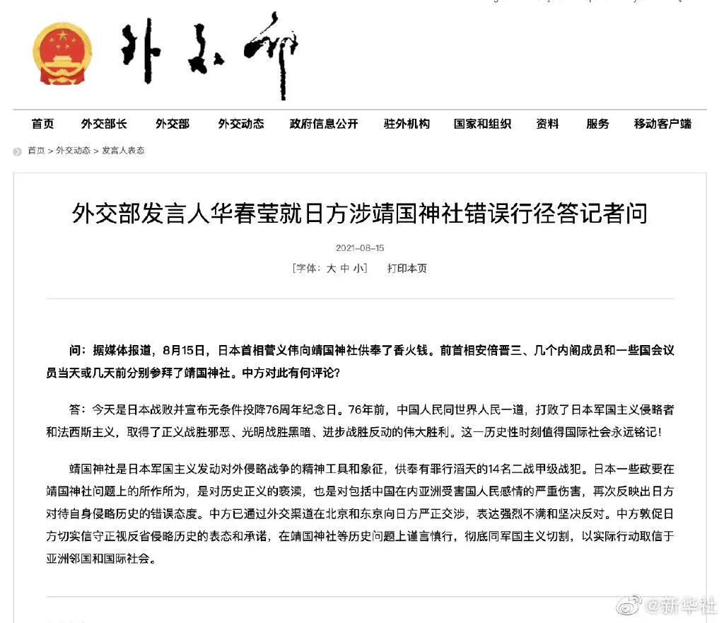 有记者问:据媒体报道,8月15日,日本首相菅义伟向靖国神社供奉了香火钱。前首相安倍晋三、几个内阁成员和一些国会议员当天或几天前分别参拜了靖国神社。中方对此有何评论?