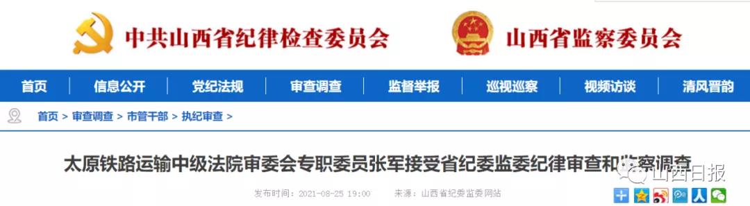 山西日报新媒体综合报道 太原铁路运输中级法院审委会专职委员张军涉嫌严重违纪违法,目前正接受省纪委监委纪律审查和监察调查。