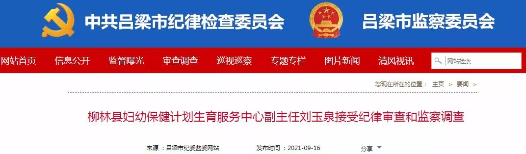 柳林县妇幼保健计划生育服务中心副主任刘玉泉涉嫌严重违纪违法,目前正接受柳林县纪委监委纪律审查和监察调査。