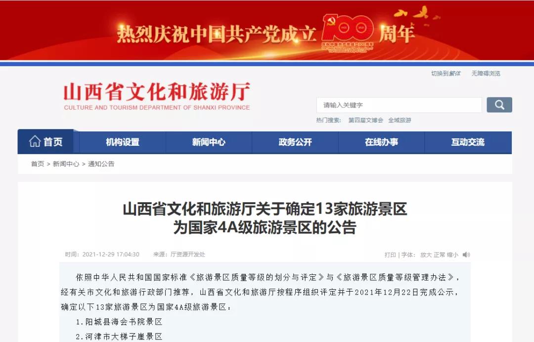 依照中华人民共和国国家标准《旅游景区质量等级的划分与评定》与《旅游景区质量等级管理办法》,经有关市文化和旅游行政部门推荐,山西省文化和旅游厅按程序组织评定并于2021年12月22日完成公示,最终确定13家旅游景区为国家4A级旅游景区。