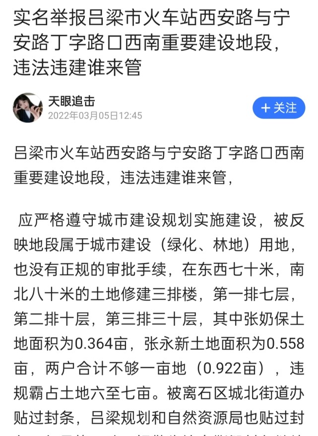 应严格遵守城市建设规划实施建设,被反映地段属于城市建设(绿化、林地)用地,也没有正规的审批手续,在东西七十米,南北八十米的土地修建三排楼,第一排七层,第二排十层,第三排三十层,其中张奶保土地面积为0.364亩,张永新土地面积为0.558亩,两户合计不够一亩地(0.922亩),违规霸占土地六至七亩。被离石区城北街道办贴过封条,吕梁规划和自然资源局也贴过封条,但是施工队无视警告擅自撕毁封条继续施工,无人追究,由此可见身后的保护伞,按照2021年7月16日《吕梁市人民政府关于开展市区违法建设“控新治旧”,百日攻坚专项整治行动的通知》背道而驰。并且建设者不属于本地户籍,农村土地修建不符合相关政策法规,根据《城乡规划法》第65条、第67条、第68条《建筑法》第64条,均属违法违规建设行为,并且也严重影响了周围整体城市规划。无任何证件的三人黑开发商,相关部门知情后应予查处,为整体城市建设合理合法重视着想,应当按《城乡规划法》第40条严格办理(拆除),追究此三人的刑事责任。薛建明,手机号:15536860000,问月连,手机号:18903583499,贺小龙,手机号:15135802111,此三人(团伙)均非本村籍人士。