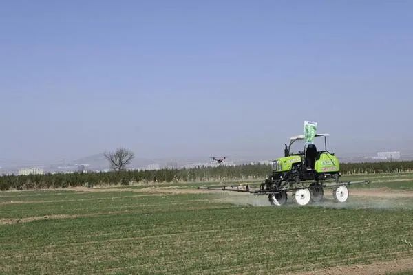 农田里,一台台自走式植保车“翅膀”打开后,均匀地喷洒着杀菌剂和水溶肥料;一架架植保无人机“嗡嗡”鸣响,在麦田上空来回穿梭,喷洒着农药……