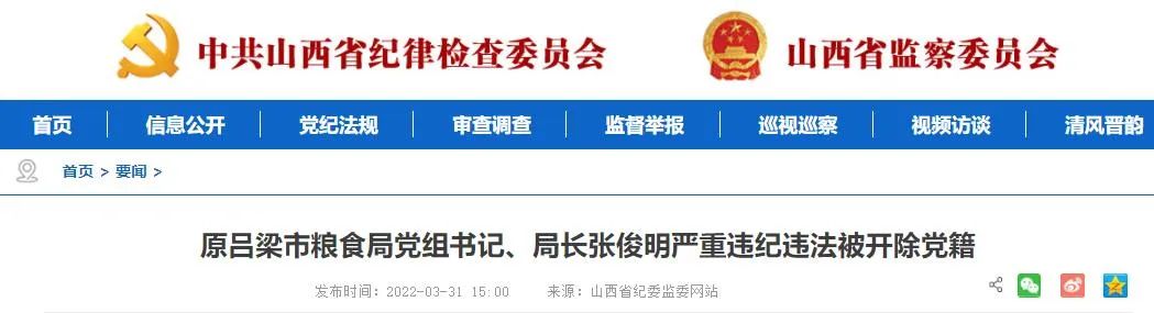 日前,经吕梁市委批准,吕梁市纪委监委对原吕梁市粮食局党组书记、局长张俊明严重违纪违法问题进行了立案审查调查。