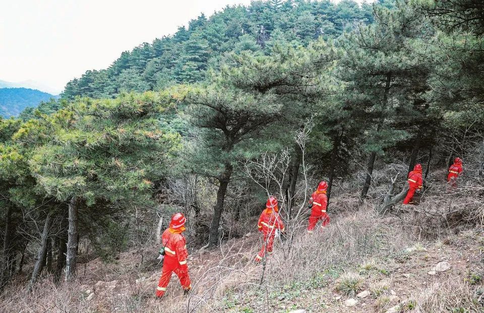 3月29日,运城市平陆县森林消防专业队队员在中条山平陆10万亩油松林巡逻,排查隐患。金玉敏/摄