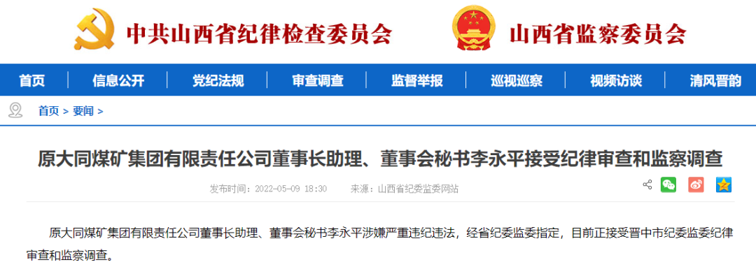 原大同煤矿集团有限责任公司董事长助理、董事会秘书李永平接受纪律审查和监察调查