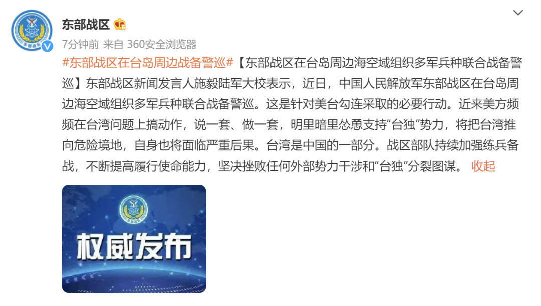 东部战区新闻发言人施毅陆军大校表示,近日,中国人民解放军东部战区在台岛周边海空域组织多军兵种联合战备警巡。这是针对美台勾连采取的必要行动。近来美方频频在台湾问题上搞动作,说一套、做一套,明里暗里怂恿支持“台独”势力,将把台湾推向危险境地,自身也将面临严重后果。台湾是中国的一部分。战区部队持续加强练兵备战,不断提高履行使命能力,坚决挫败任何外部势力干涉和“台独”分裂图谋。