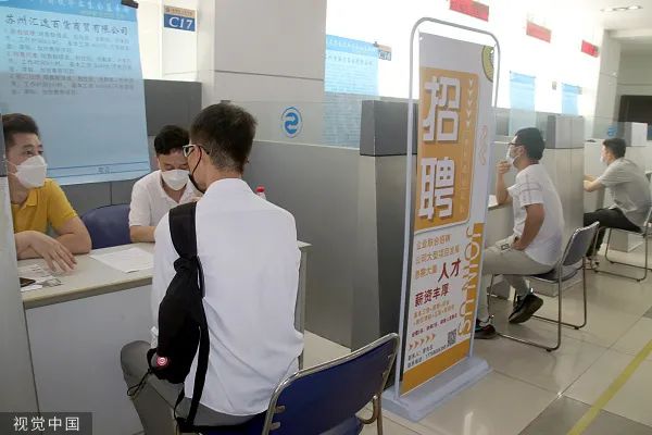 资料图:2022年7月4日,苏州,求职者在招聘会上与工作人员洽谈。图/视觉中国