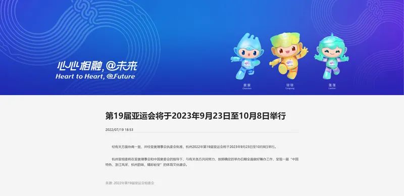 据杭州2022年第19届亚运会官网消息,经有关方面协商一致,并经亚奥理事会执委会批准,杭州2022年第19届亚运会将于2023年9月23日至10月8日举行。