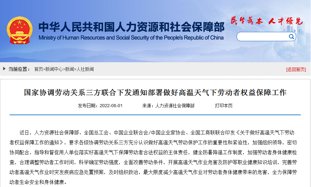 据人力资源和社会保障部网站消息,人社部、全国总工会等多部门近日联合印发了《关于做好高温天气下劳动者权益保障工作的通知》,要求各级协调劳动关系三方指导和督促用人单位合理安排劳动者在高温天气下的户外工作时间,尽量避开酷热时段作业,适当增加劳动者休息时间和轮换班次,尽量缩短室外连续工作时间。