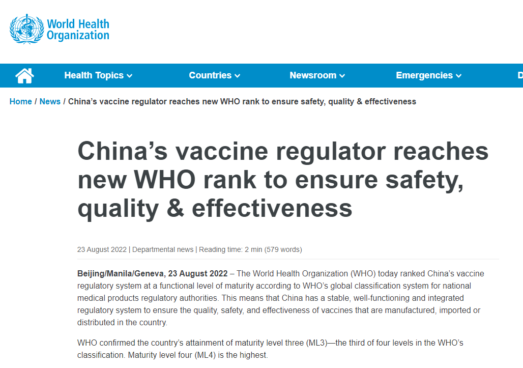 8月23日,世界卫生组织(WHO)宣布中国通过疫苗国家监管体系(NRA)评估。