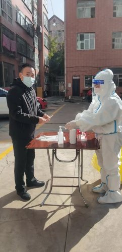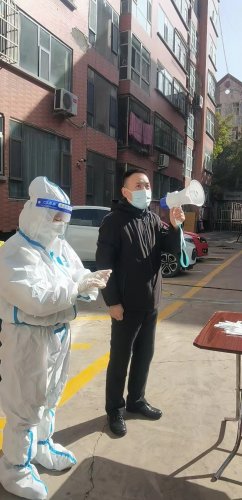 10月28日,离石再次临时全域静默管理,特殊时期,莲花街道办昌宁社区城南信用社家属院党员志愿者服务队志愿服务工作。在小区楼下用喇叭“请戴好口罩”‘‘有序下楼做核酸’’……一声声提醒、一声声叮咛,坚持站好岗、扛起责,主动服务小区居民。